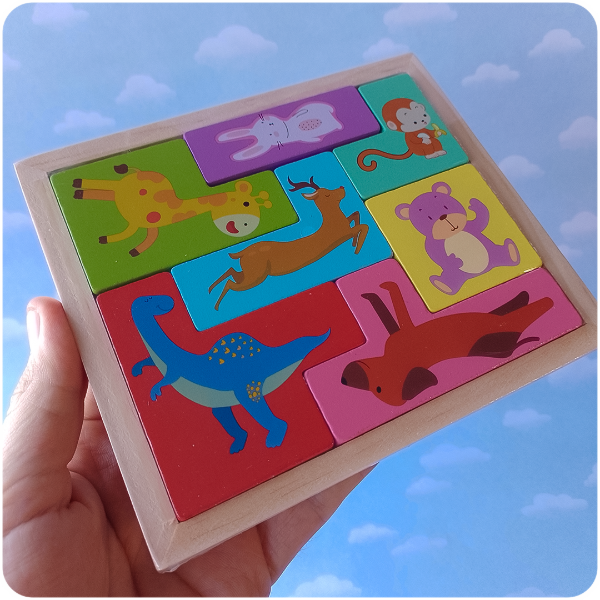 Incluye 7 piezas de madera con formas, colores y dibujos de distintos animales que deben encastrarse correctamente en el marco, como en el clásico juego Tetris.