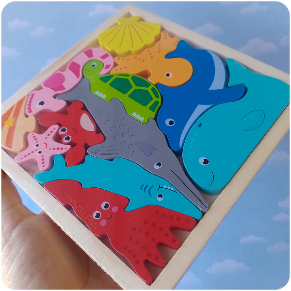 Incluye 12 piezas de animales marinos que encajan en la base, cada una con su silueta guía para facilitar el juego. Perfecto para aprender sobre el mundo acuático mientras se practica la lógica y el encastre.