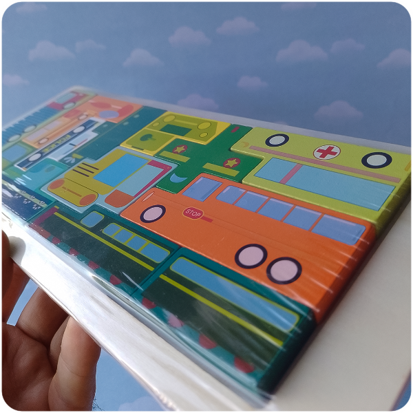 Incluye 14 piezas de madera con ilustraciones de distintos medios de transporte, como colectivos, ambulancias, patrulleros, trenes y más. Cada ficha encastra de manera única, estimulando el pensamiento lógico, la observación y la resolución de problemas.
