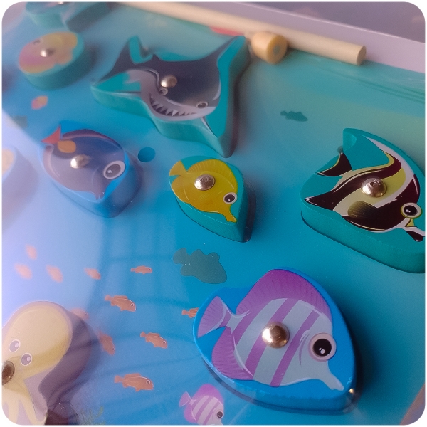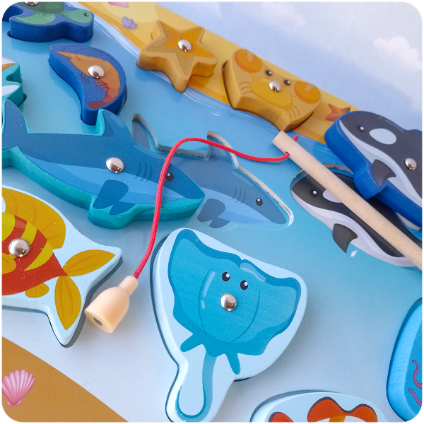 Una propuesta didáctica que encanta a grandes y chicos. Este juego de madera permite "pescar" animales marinos con una caña imantada, promoviendo el desarrollo de la coordinación ojo-mano, la motricidad fina y el juego simbólico.