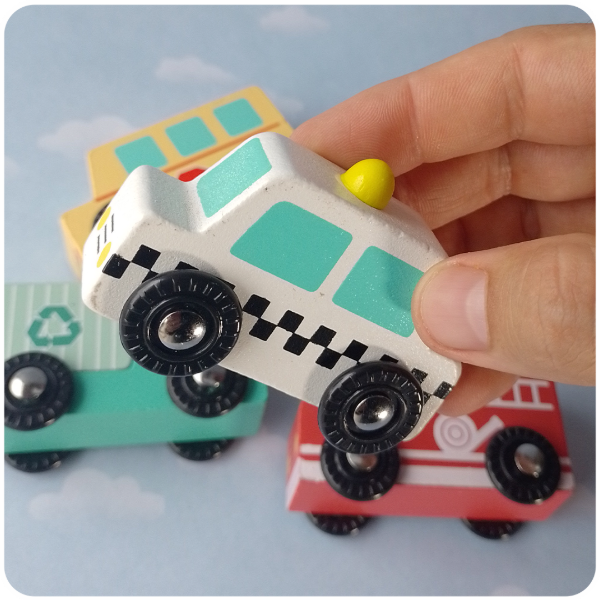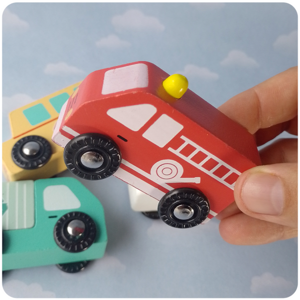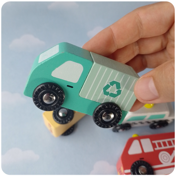¡Aprender sobre la comunidad y sus trabajos nunca fue tan divertido! Estos autitos de madera invitan a crear historias de rescate, servicio y transporte.