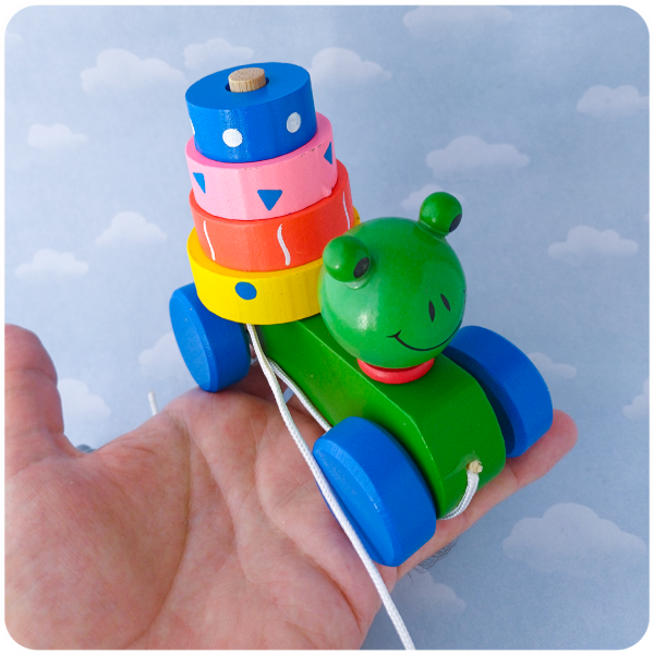 Un compañero 2 en 1 para sus primeros pasos y descubrimientos! Esta simpática ranita de madera es un juguete de arrastre y un rompecabezas de apilamiento, todo en uno, para duplicar la diversión.