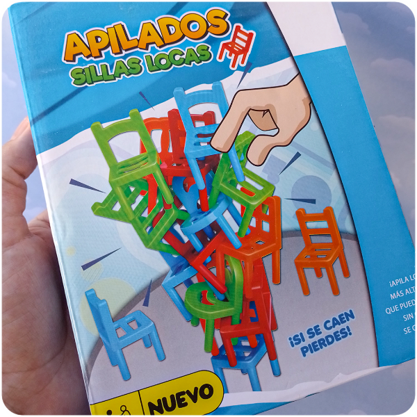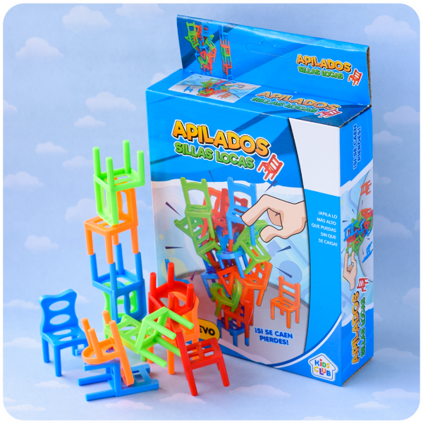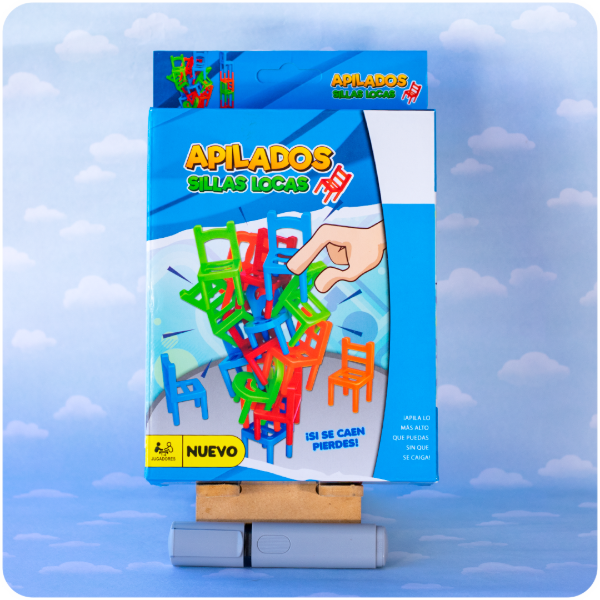 🤸‍♀️ Dinámica de juego: Los jugadores deben apilar 24 mini sillas una sobre otra, intentando que no se caigan. La dificultad aumenta con cada silla colocada, requiriendo estrategia y un pulso firme para mantener el equilibrio.